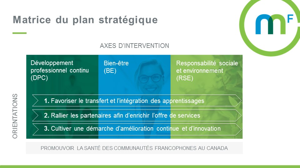 Depuis quelques années, l’association s’est en outre distinguée par sa préoccupation à contribuer au bien-être du médecin et à développer ses compétences comme entrepreneur social écoresponsable. Par ses trois axes, le DPC, le bien-être et la responsabilité sociale et l’environnement, Médecins francophones du Canada s’engage à rallier les médecins et les organisations en santé à des objectifs qui favorisent une médecine de qualité pour répondre aux besoins des patients et des communautés francophones.